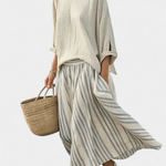 Prirodno i elegantno, cjelina Daisy slavi mediteransku svježinu s mekom majicom širokih rukava i prozračnom midi suknjom s prugama. Izrađena od lino bambusa s mekom teksturom i fluidnim padom, idealna je opcija za sunčane dane, obalne šetnje ili mirne izlete s udobnim stilom.