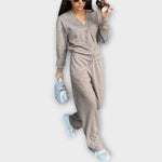 Ovaj set je savršen izbor za one koji traže stil i praktičnost u jednom komadu. S ravnim krojem hlača i kaputom s velikim gumbima i klasičnim izgledom, spaja udobnost ležernog izgleda s dotjeranim dodirom idealnim za različite prigode — od posla do izleta. Moderni, udobni i uvijek elegantni izgled.